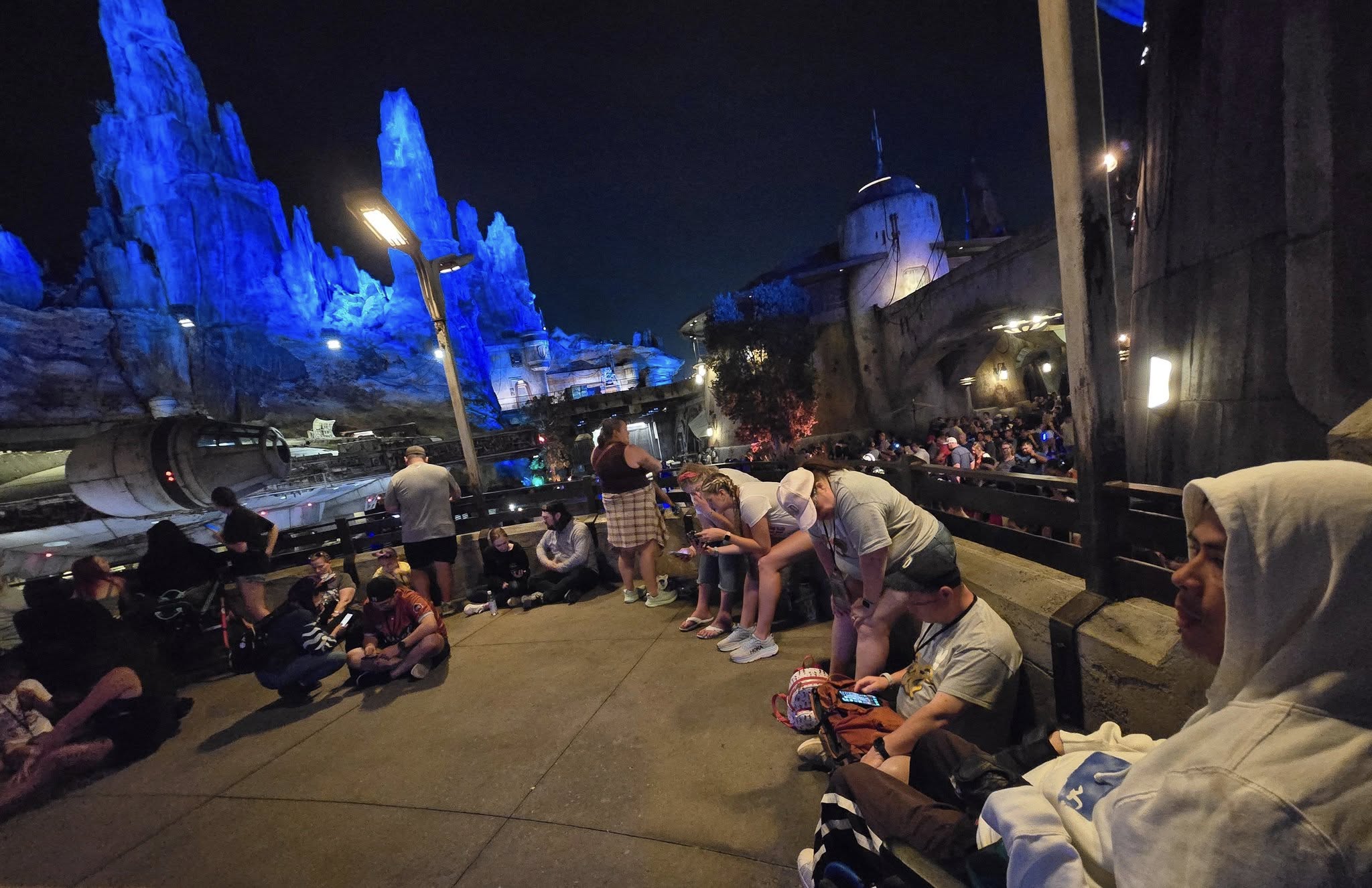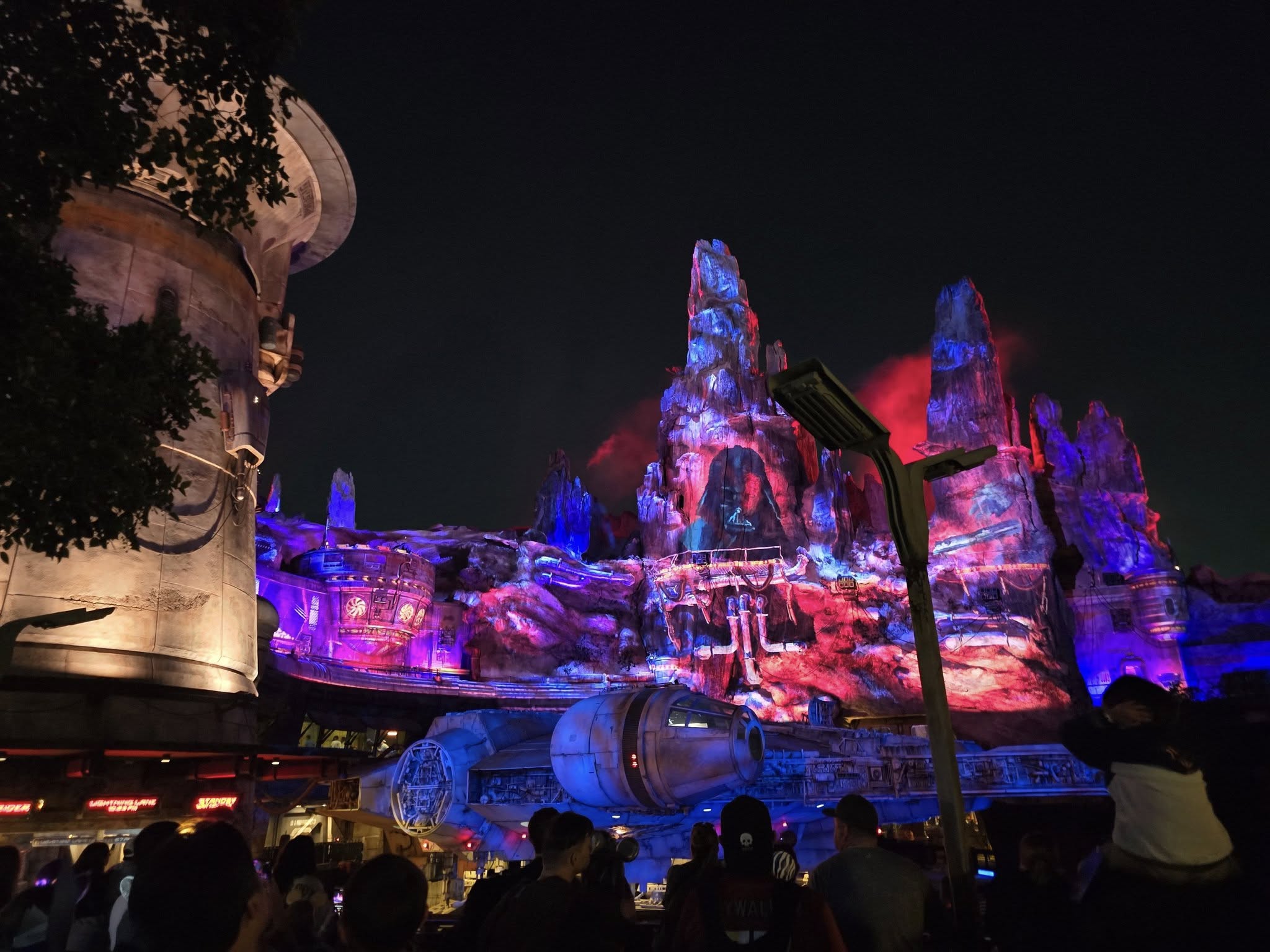 We then headed over to Star Wars: Galaxy Edge to catch the 10:15 PM showing of Shadows of Memory: A Skywalker Saga. This brand new show is about 10 minutes long and debuted on March 28, 2025 with Season of the Force. The Spires of Batuu transform into a canvas for the story of the Skywalker Family from episode 1 to 9.