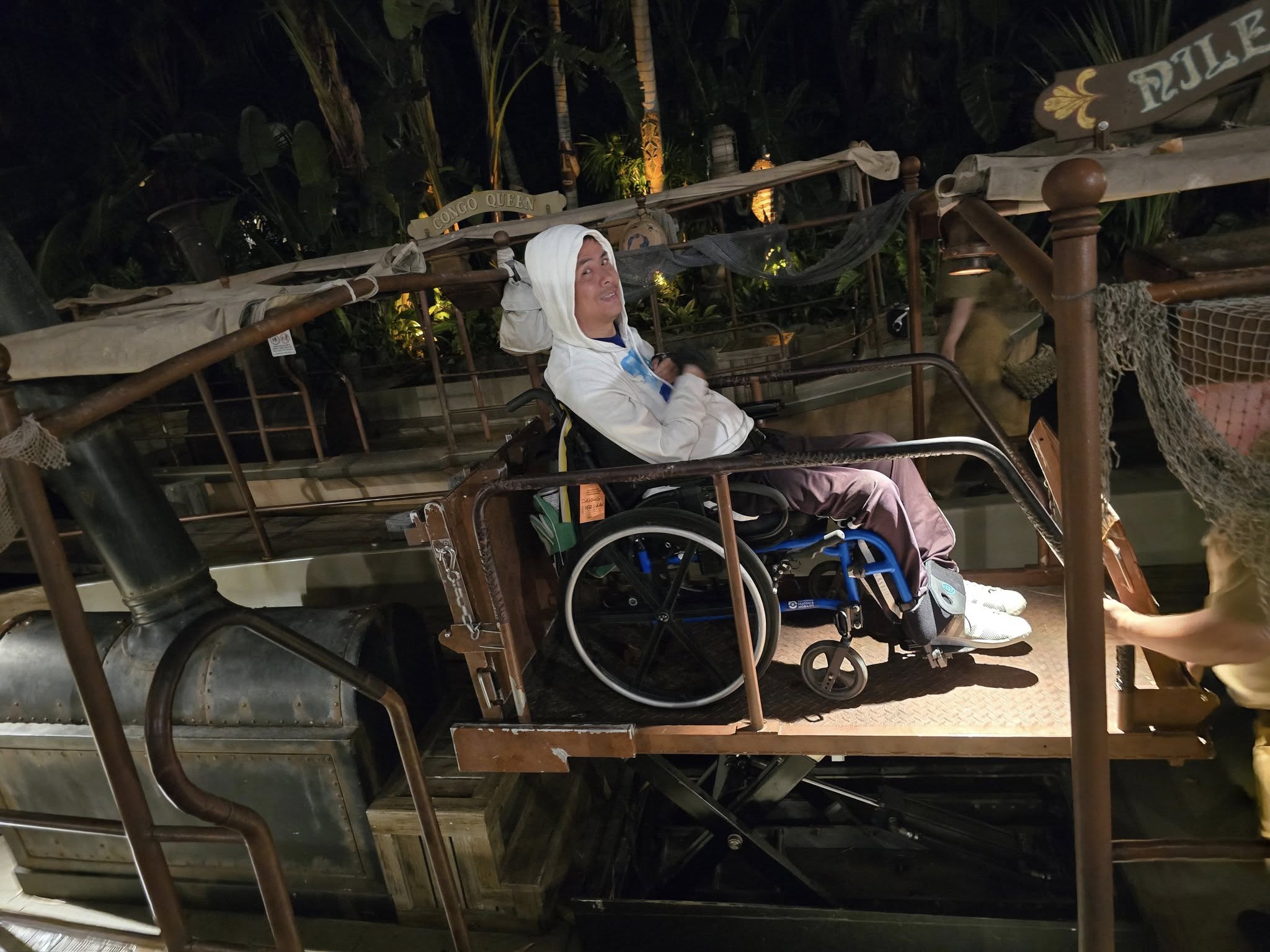 My last ride of the night was the Jungle Cruise ride. This ride is also wheelchair accessible and is one of my favorites. After boarding on the accessible boat, we get to travel through various rivers around the world, seeing different animatronics and laughing at our skipper’s puns and jokes.