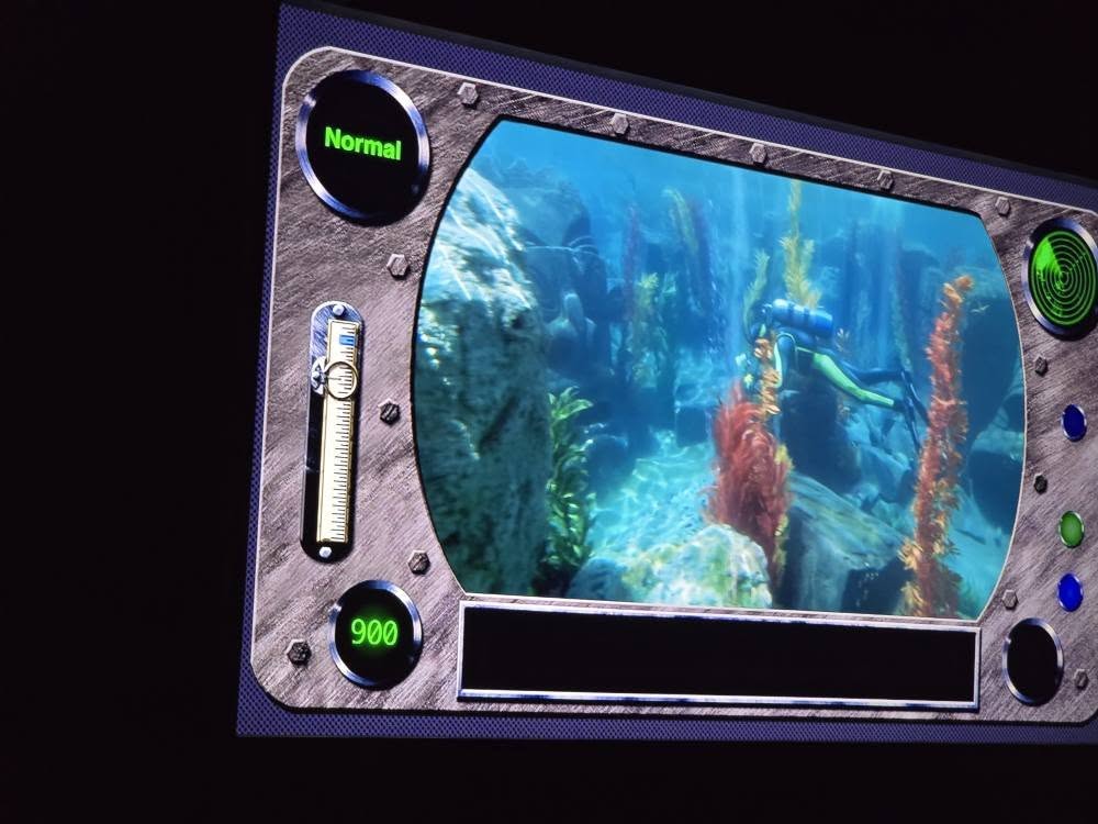 The Observation Outpost is at the end of the dock, as we get to go inside a little room. I got to stay in my wheelchair as my friend gets to take a seat. We get to watch a live version of the voyage via a submarine cam. Here we go on a 12 minute underwater adventure to find the famous clown fish Nemo. We see scuba divers and other characters from the movie like Dory, Marlin, Squirt and more.