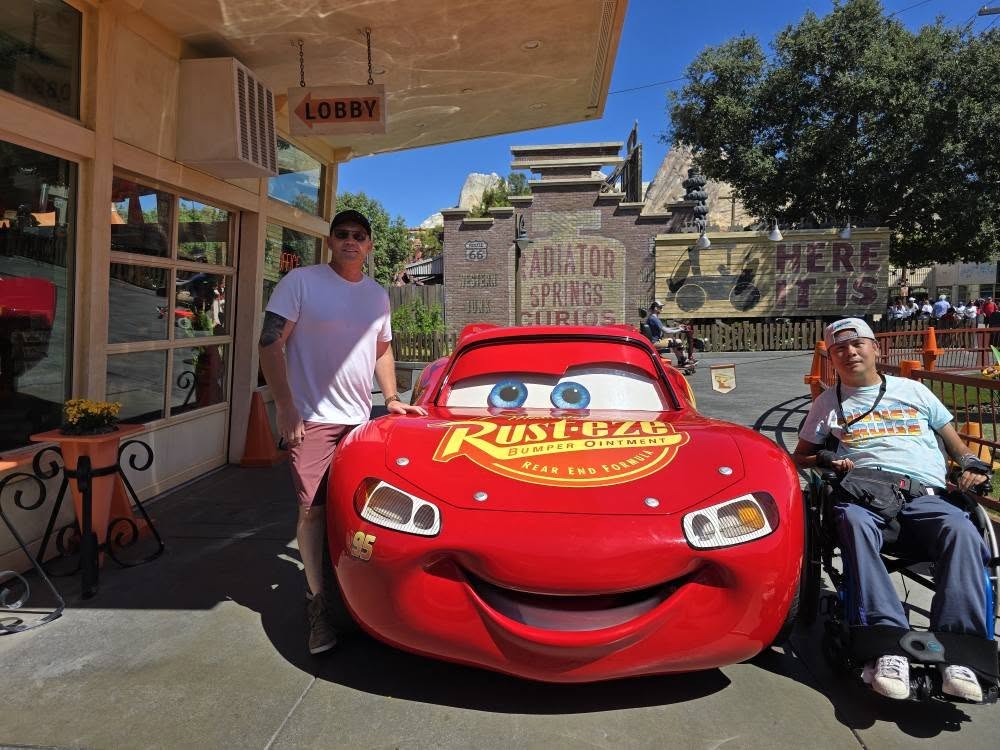 My friend went to ride Grizzly River Run while I rested and charged my phone. We then headed to Cars Land to spend some time and explore the area more. We took pictures in front of the giant Welcome billboard and a few of the shops in Cars Land. We even got a chance to take a picture with Lightning McQueen.
