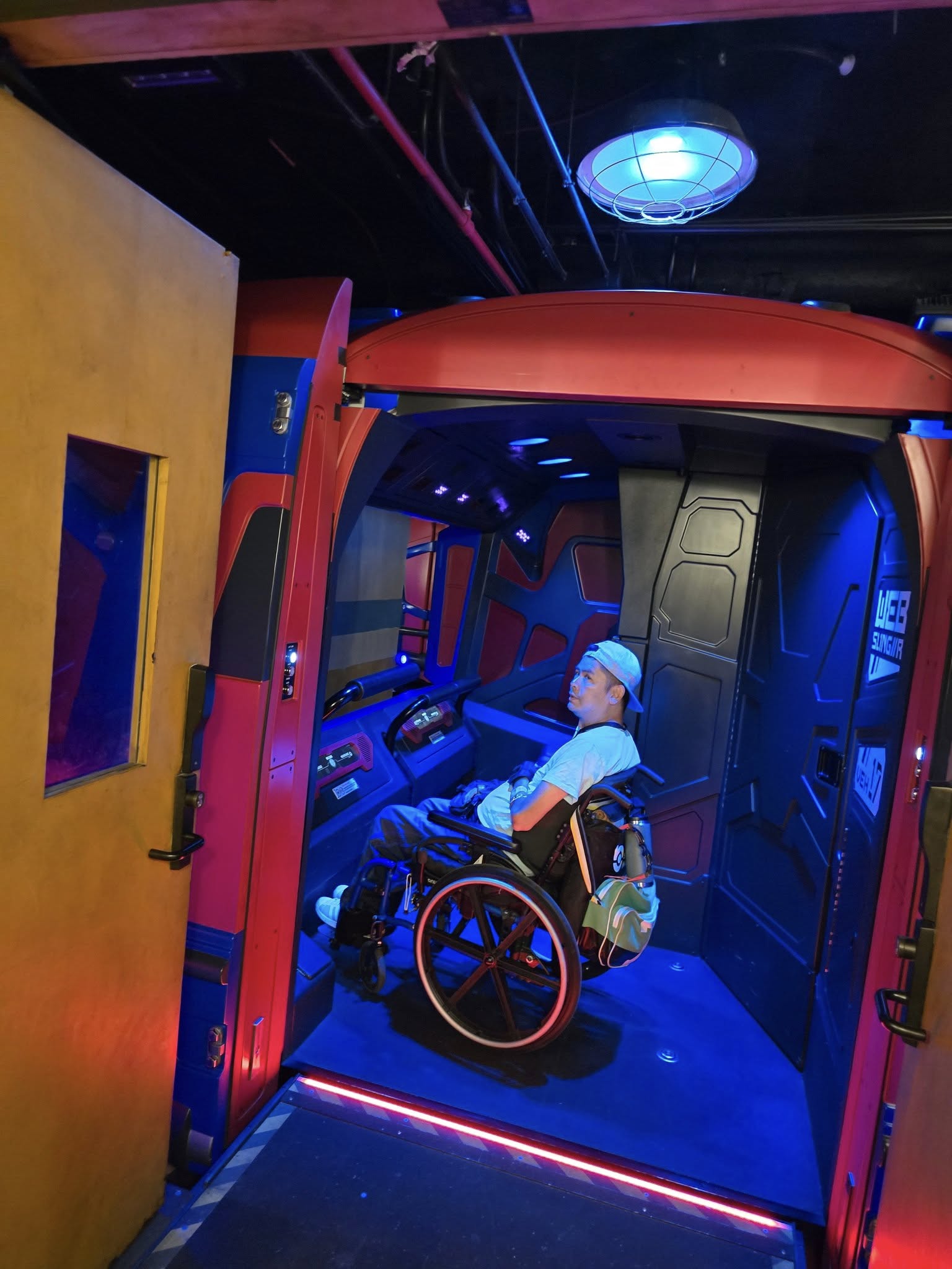 There is one WEB Slinger vehicle that is wheelchair accessible where my wheelchair is strapped inside and locked into place. We are to put on our 3D glasses before the ride started. I was able to fling out my wrists to simulate web slinging to destroy the enemies. Since the ride wasn’t too busy, we got to ride this 3 times in a row.