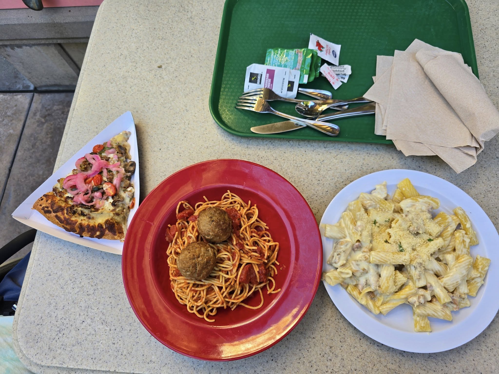 Prices weren’t too bad, and I got a plate of spaghetti and meatballs for only $11.49. My friend got a slice of pizza and a plate of 4 cheese rigatoni. We sat outside since it was so hot and enjoyed our meal in the sun. We were both surprised how good the food was.