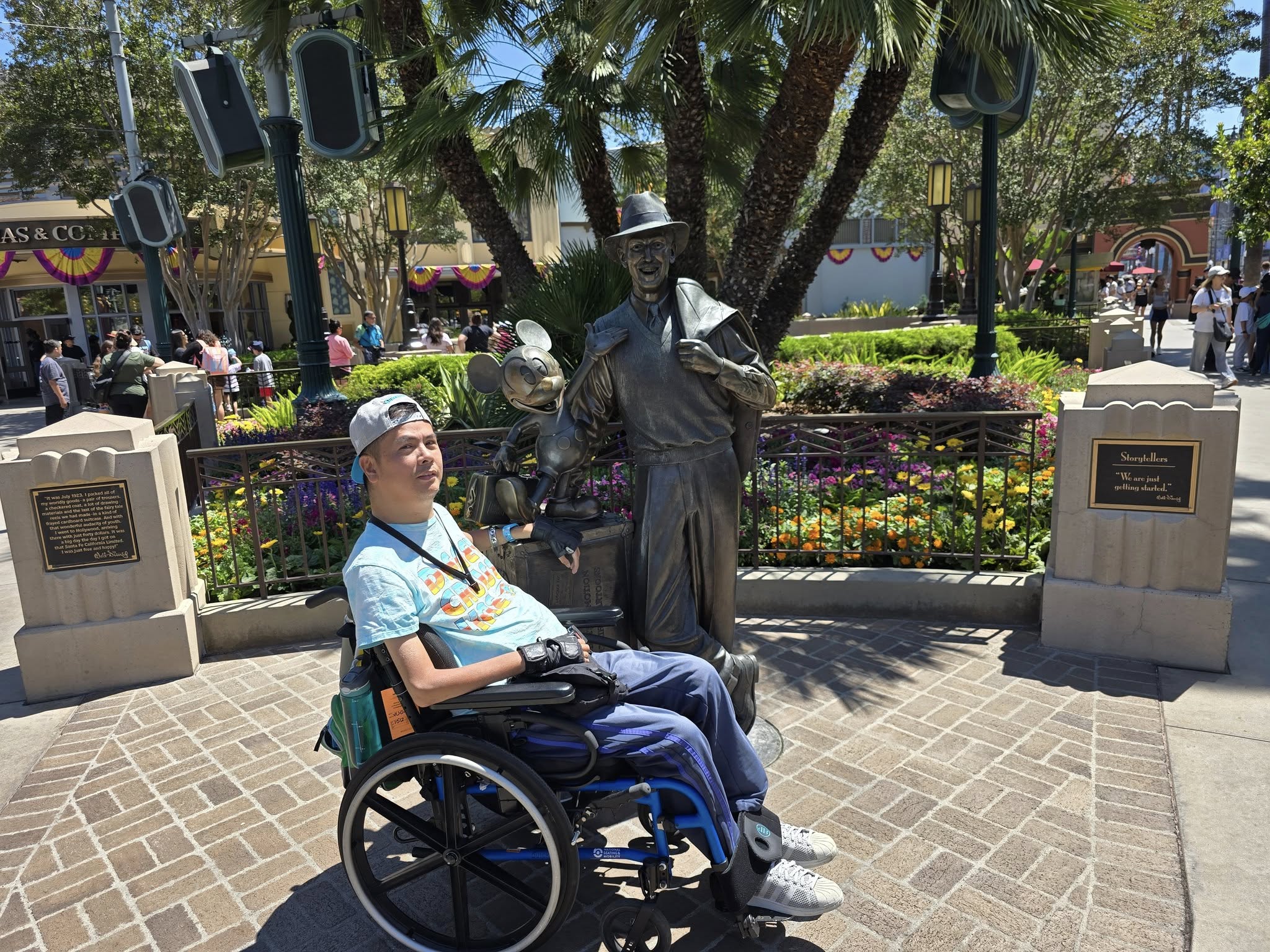 Buena Vista Street is the first area/land we are in when entering the park. At the end of the street is Carthay Circle which has a Central Hub that connects to some of the lands in the park. I wanted to take a picture with the iconic “Storytellers” statue which is Walt Disney himself with Mickey Mouse.