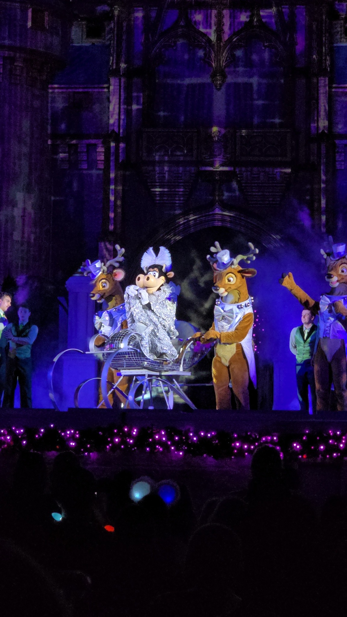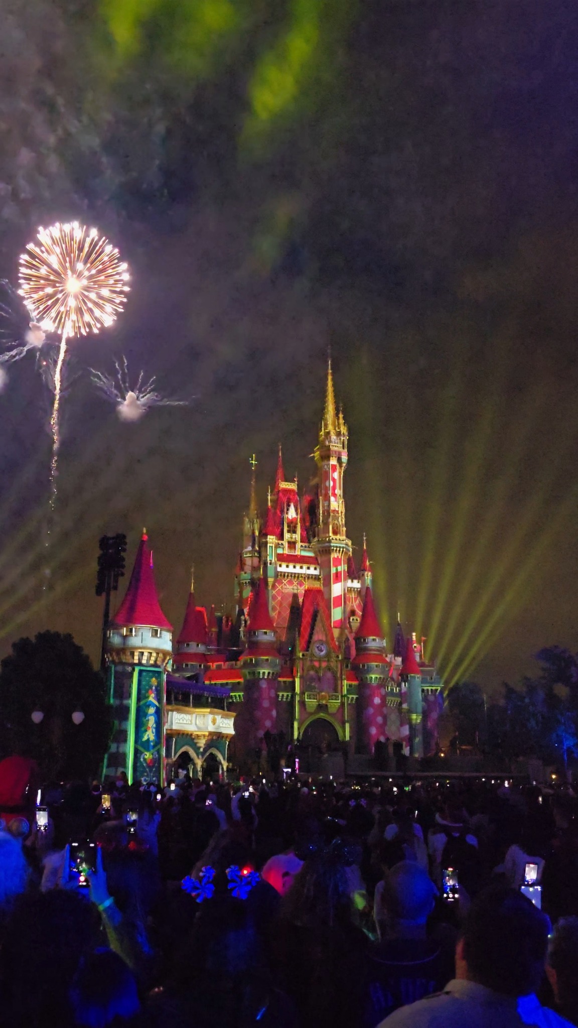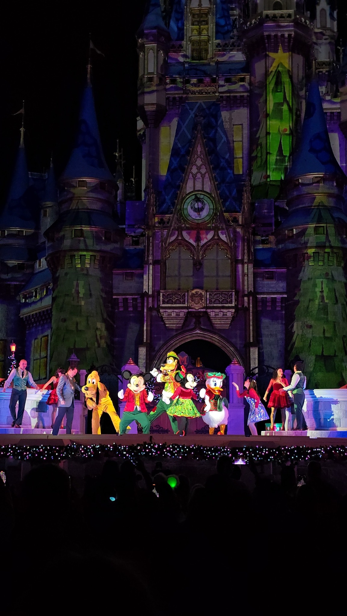 Even though it was crowded viewing it with everyone, I was still able to see. The show combines a musical score of classic Christmas songs with castle projections, low-level pyrotechnics, and a large-scale fireworks display above Cinderella Castle. It is hosted by Minnie Mouse, inviting everyone to come together to celebrate Christmas.