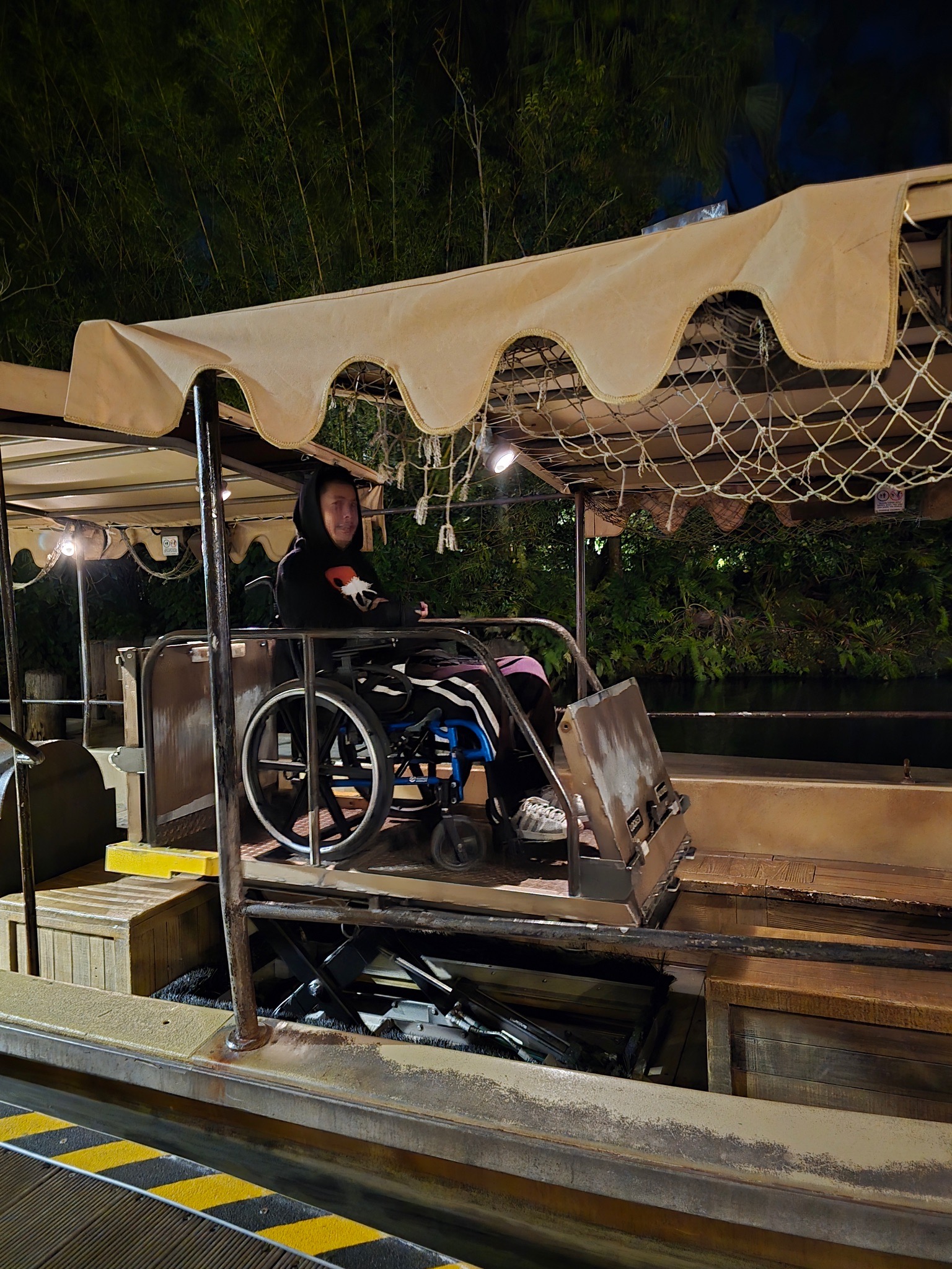 This overlay was not exclusive during party hours like some other rides. I just went on this ride a few months ago at Disneyland but wanted to see if the overlay made a difference. Getting on the boat is easy as always since there is a ramp and a spot for wheelchairs. It was cool to see some of the holiday decor and hear some of the holiday jokes but it is still the equally fun experience.