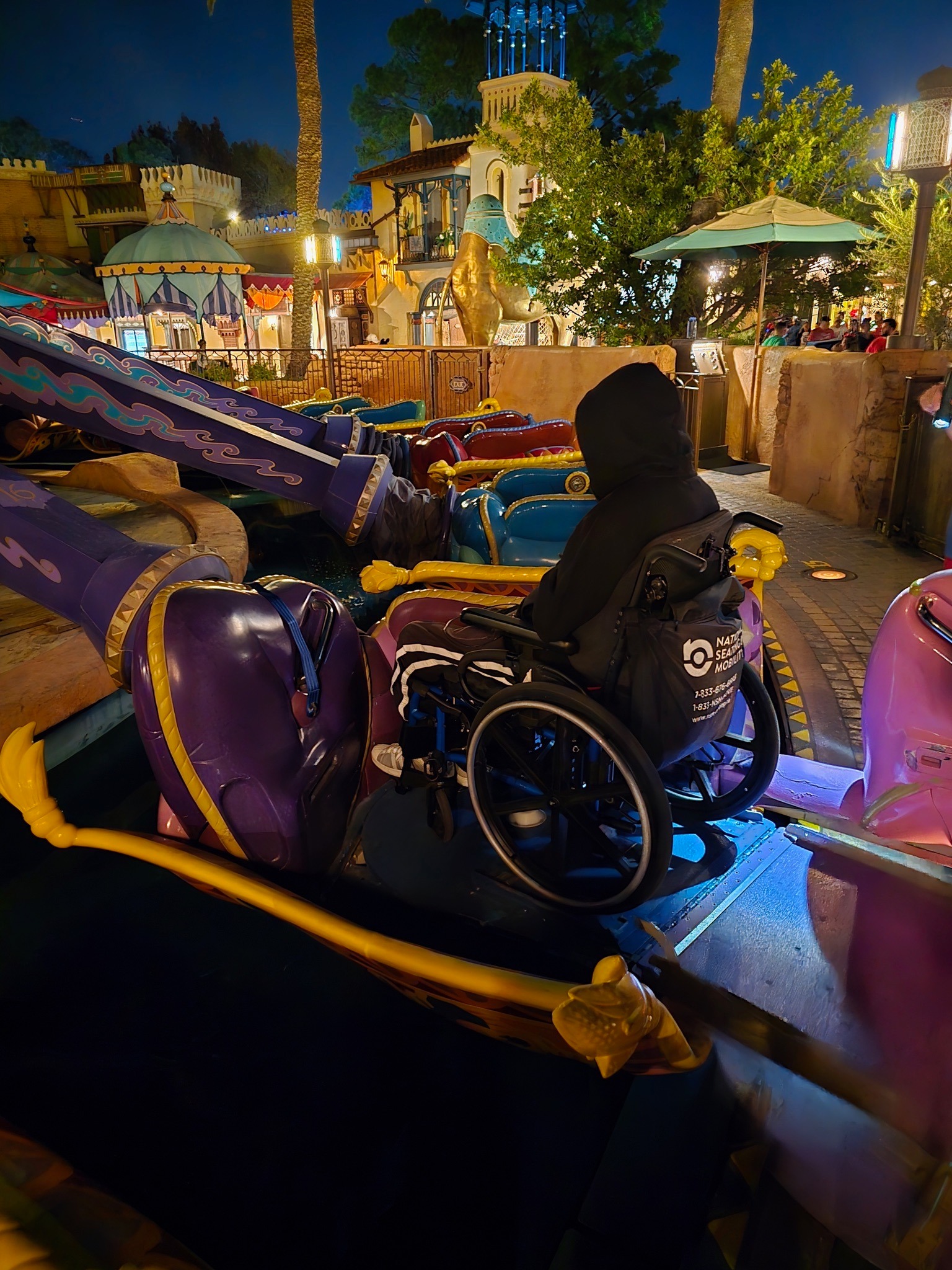 The carpet ride vehicle is wheelchair accessible so I could remain in my wheelchair. A cast member would tie my chair down and put a seatbelt on me. My friend sat in the front seat and controlled the height of the carpet. It was an easy ride that spun around for less than 2 minutes. It was a bit dizzying but we got to ride this twice in a row.
