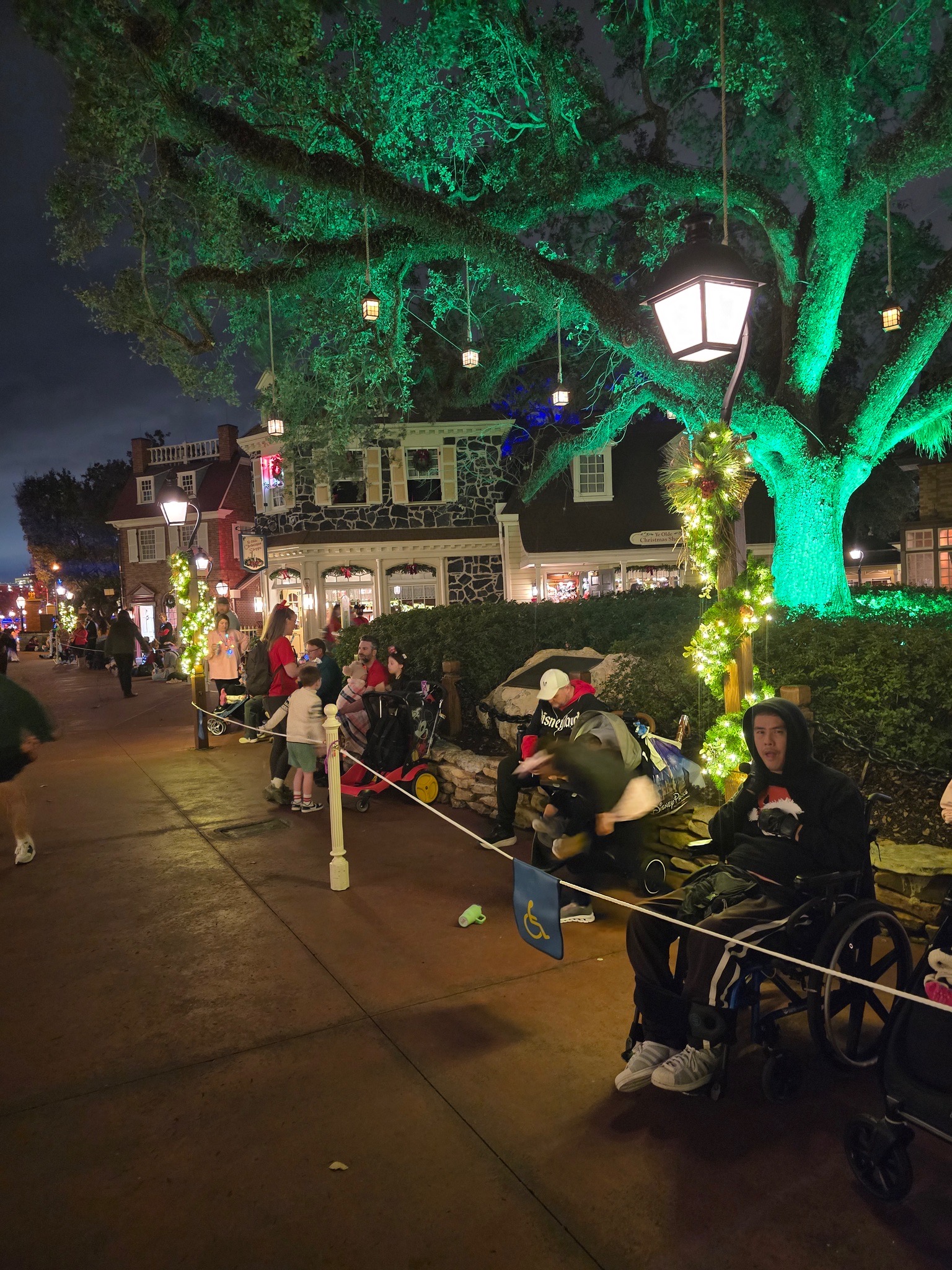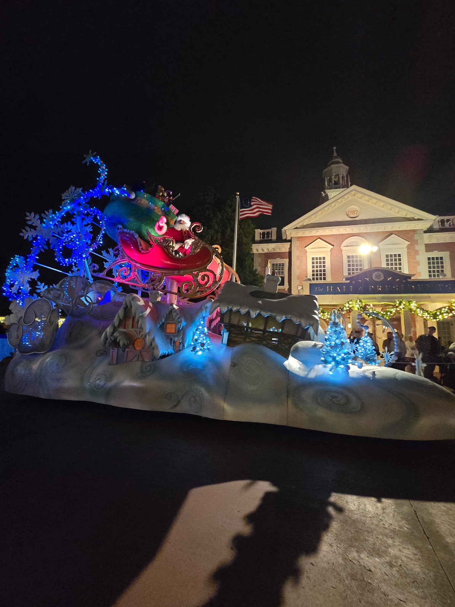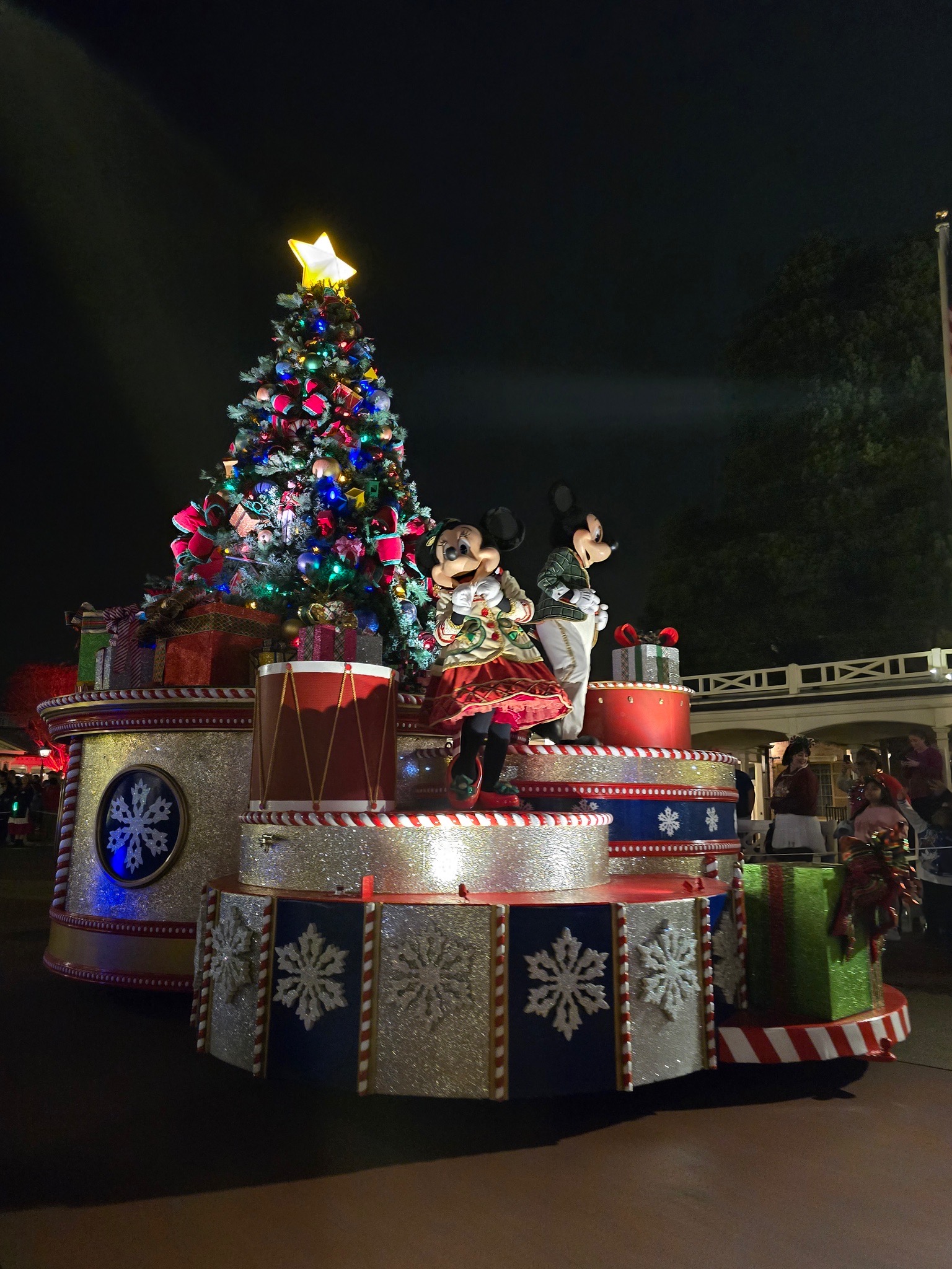 The next thing to do was to see Mickey’s Once Upon a Christmastime Parade. There was a showing at 8:30 PM and at 11 PM. The earlier parade is the busier one so we planned for the later show. Right after the fireworks we went directly to find one of the accessible viewing areas. We were quite early so I held our spot while my friend got our 5th cookie of the night to eat while waiting for the parade to start.