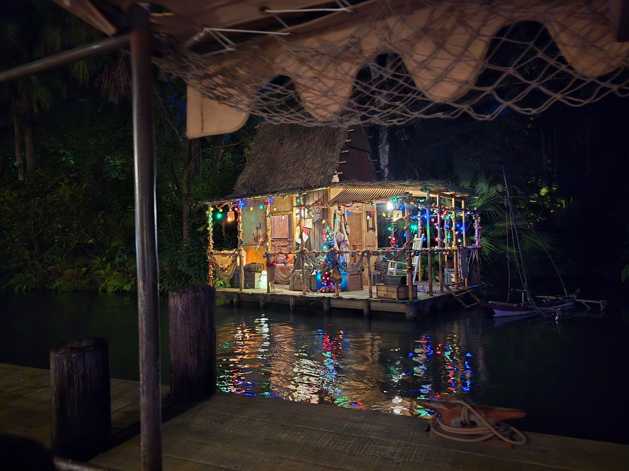 Jingle Cruise is just the Jungle Cruise ride with a holiday overlay. This classic boat ride opened with the park in 1971 and between early November to early January, the holiday overlay adds decorations to the queue area and boat dock area. There is also Christmas gifts and props along the ride while skippers tell us holiday themed jokes.