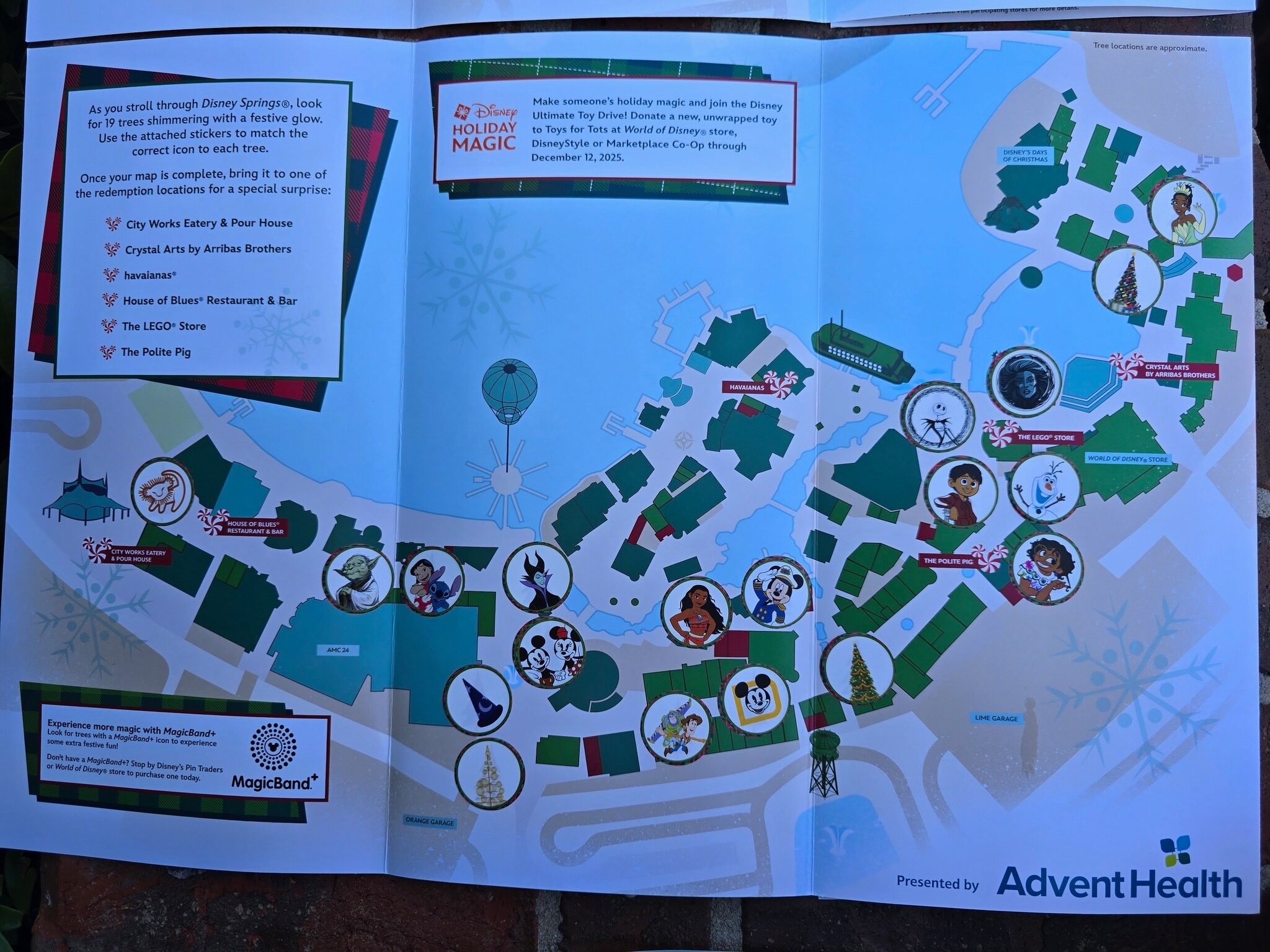 There was also a directory map book with the location of 19 Christmas trees located around all of Disney Springs. We were to collect stickers for each tree and once all 19 were found, we were to trade the map book for a free Christmas tree ornament.