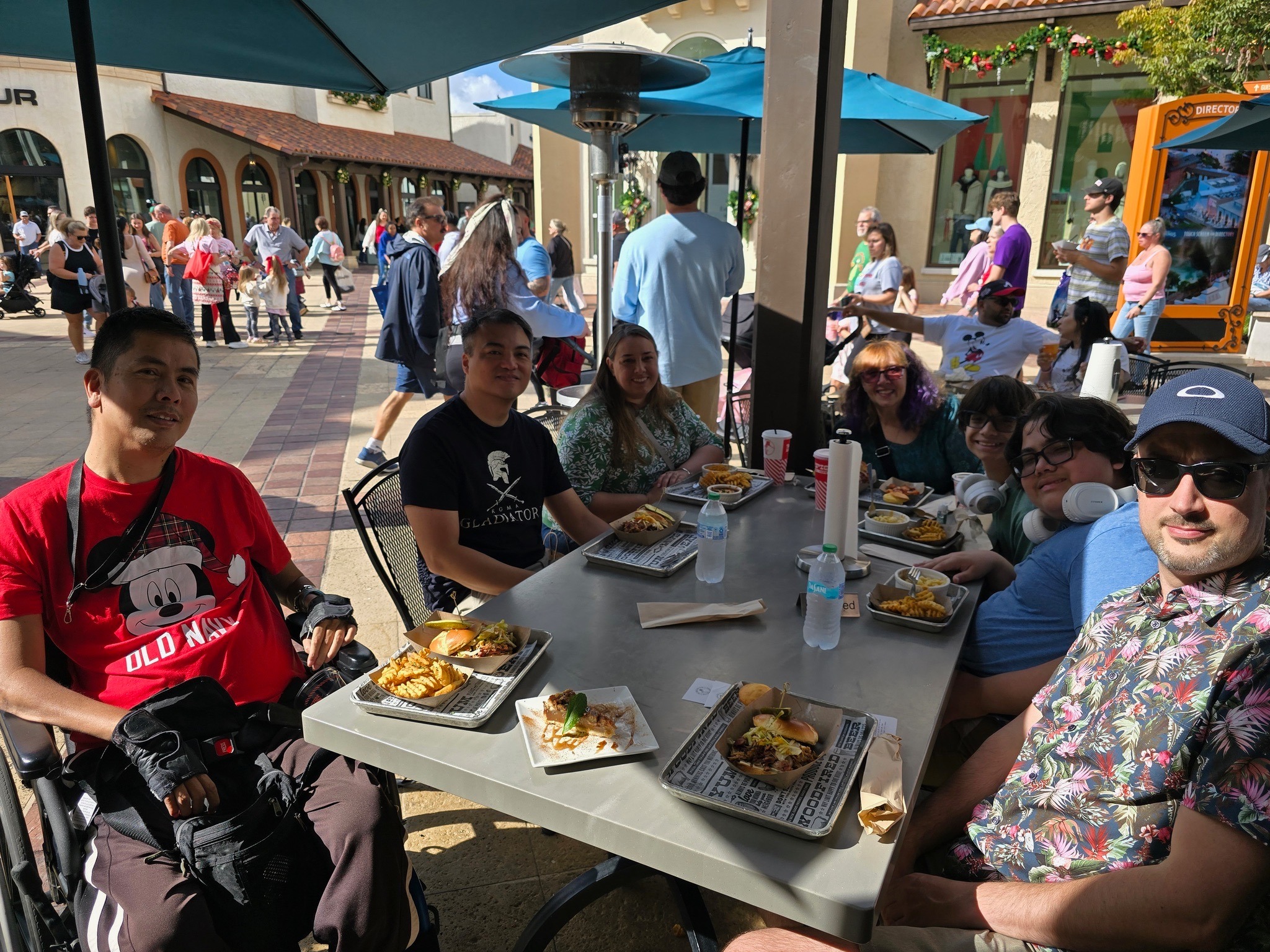 The place was quite busy as it took us several minutes to find a table to fit the 7 of us that is also to get to with my wheelchair. We got a nice spot on the patio as it was sunny and hot outside. The food was quite good and we were quite close to some entertainment nearby to enjoy while eating.