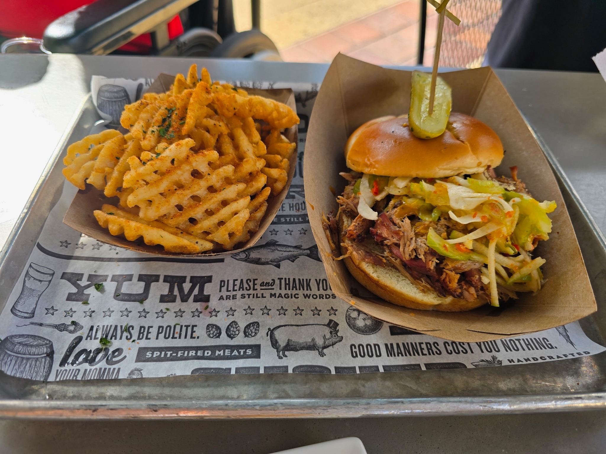 Southern pig sandwich and waffle fries
