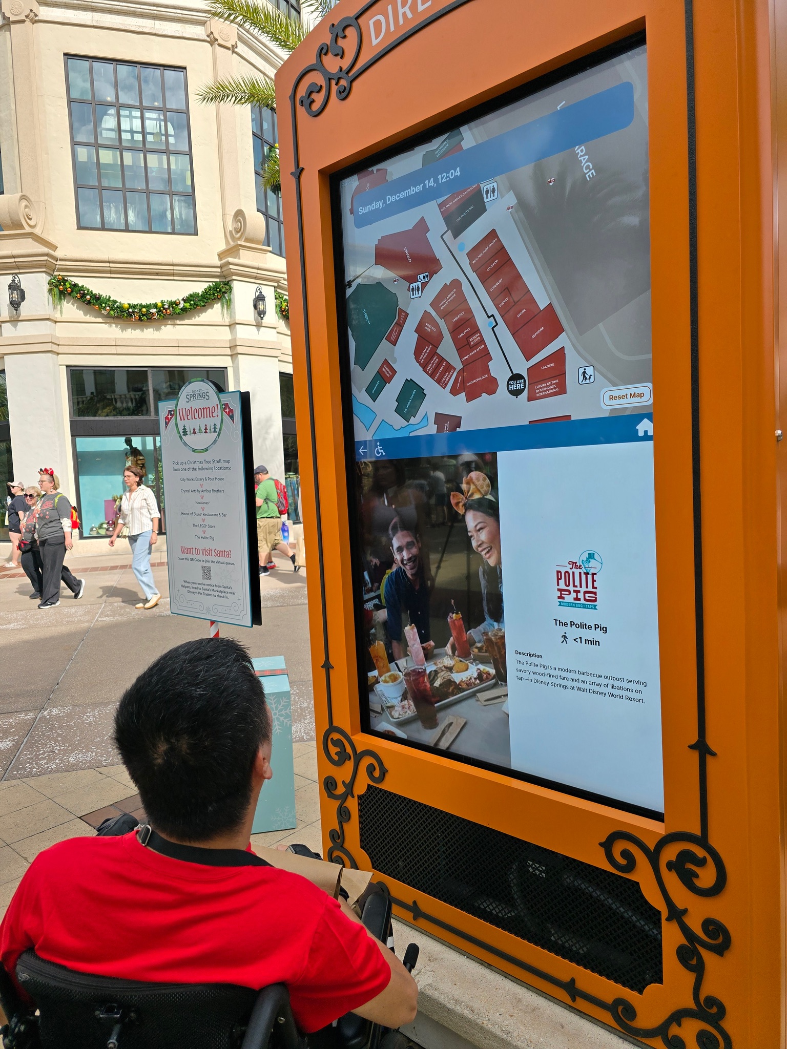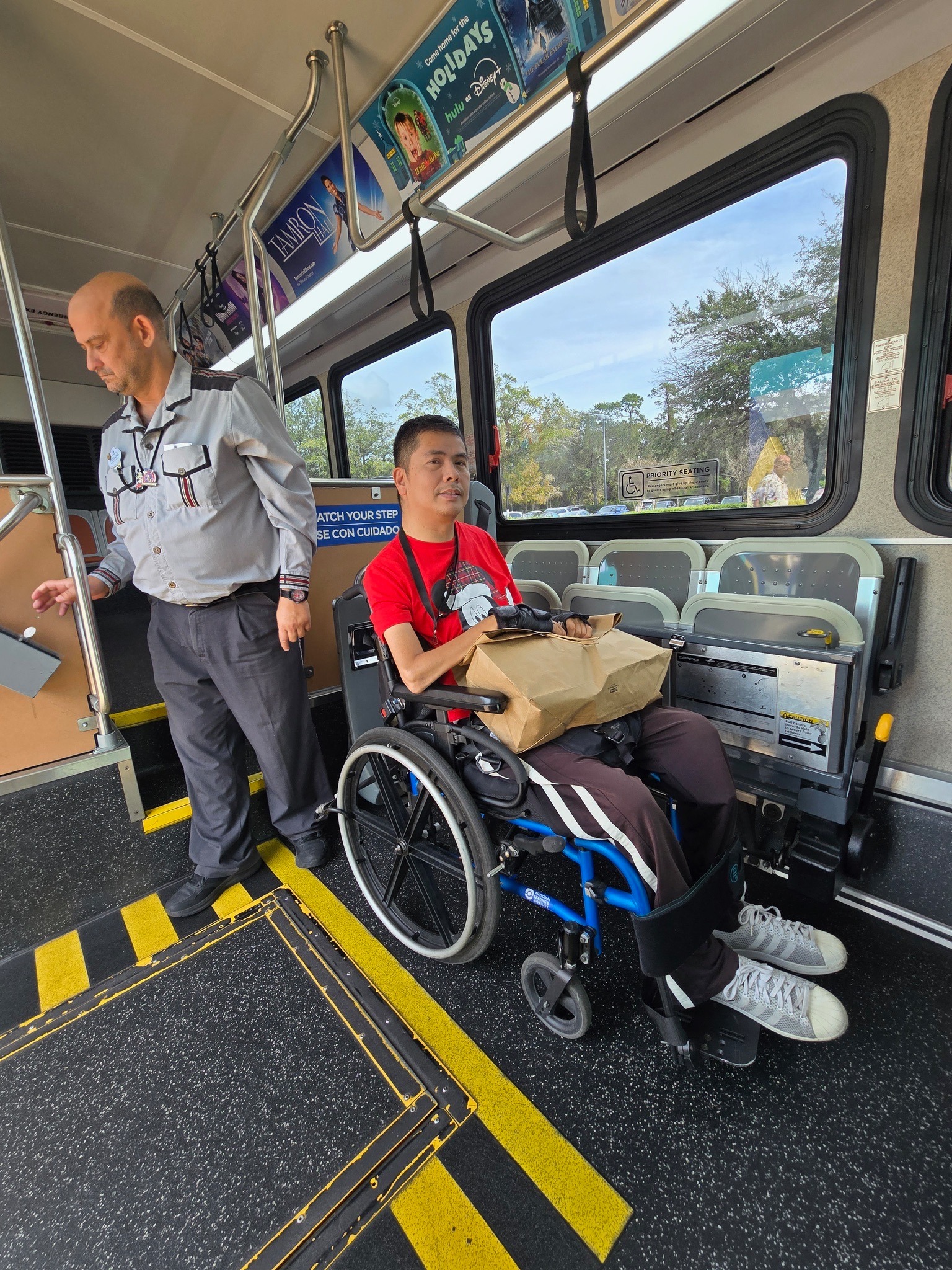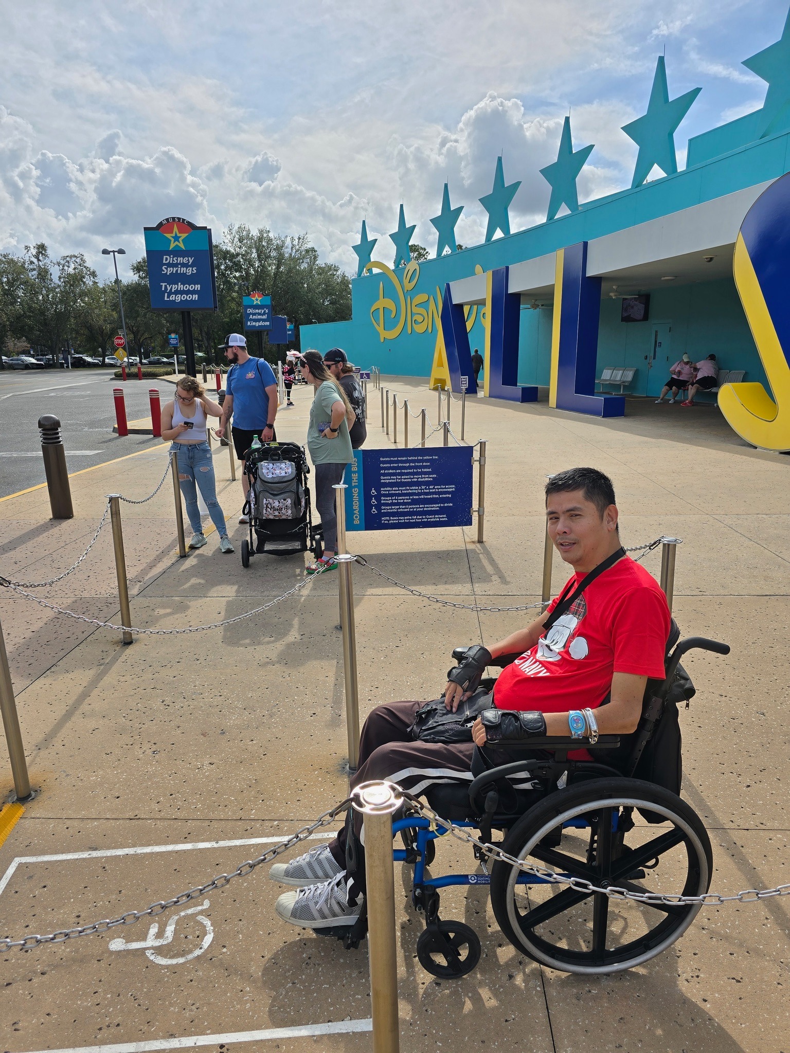 We were staying at Disney’s All Star Music Resort, so it was very easy to get to Disney Springs. There was a bus stop right in front of the main building and all Disney guests get free bus rides within Disney World. Wheelchairs get a special shorter line to wait for the bus and are loaded on the accessible ramp before all the other guests get to board the bus.