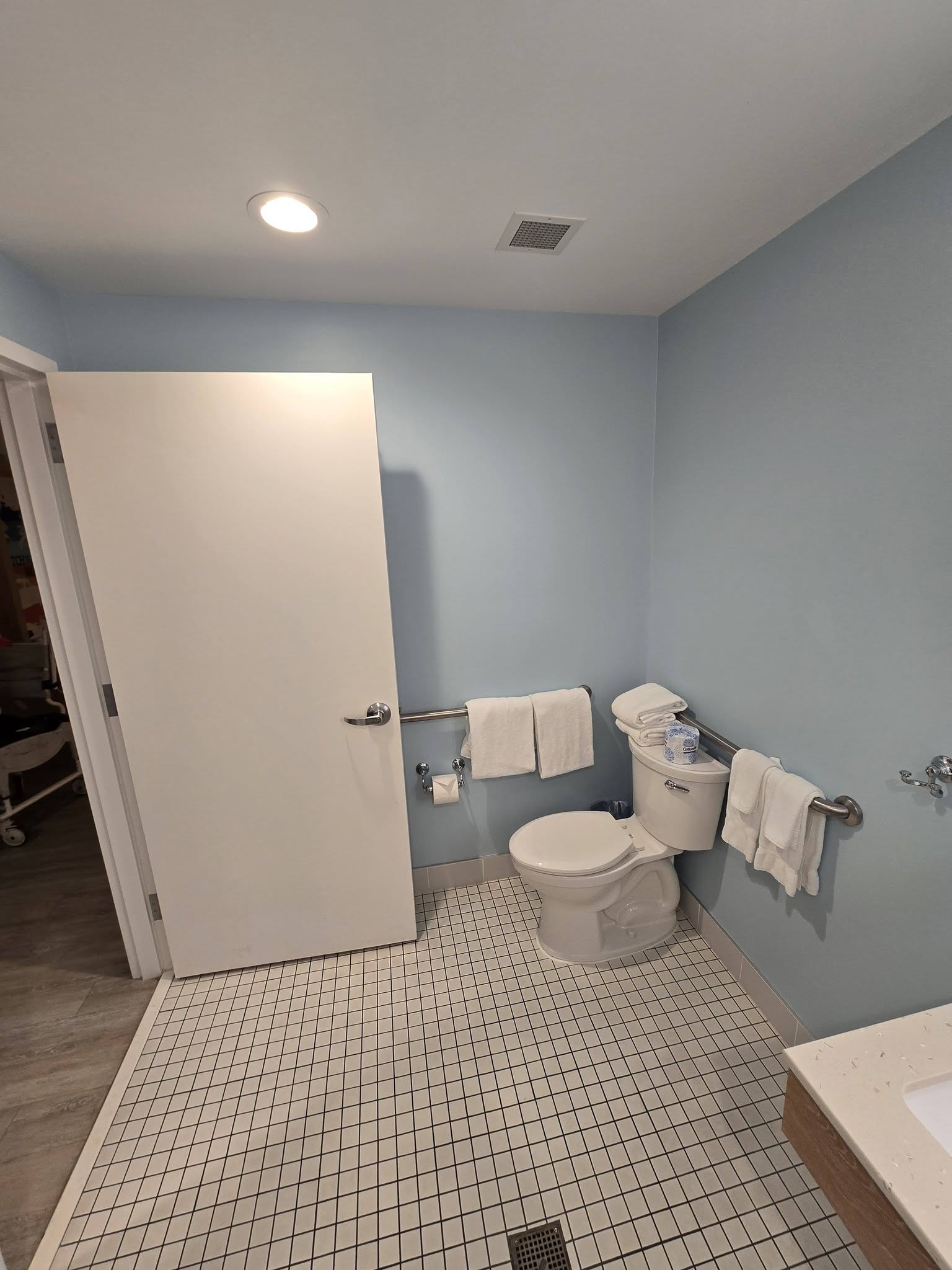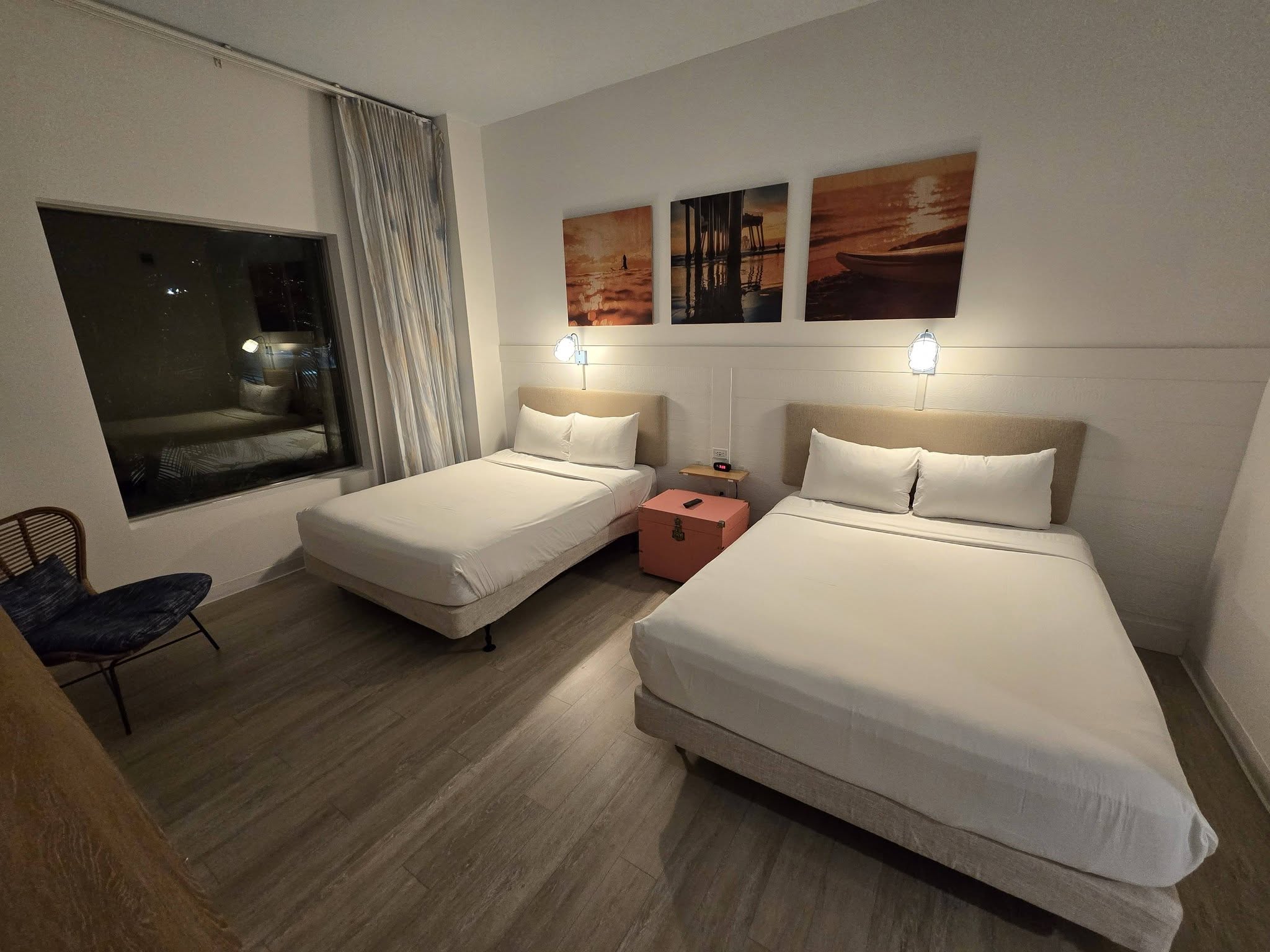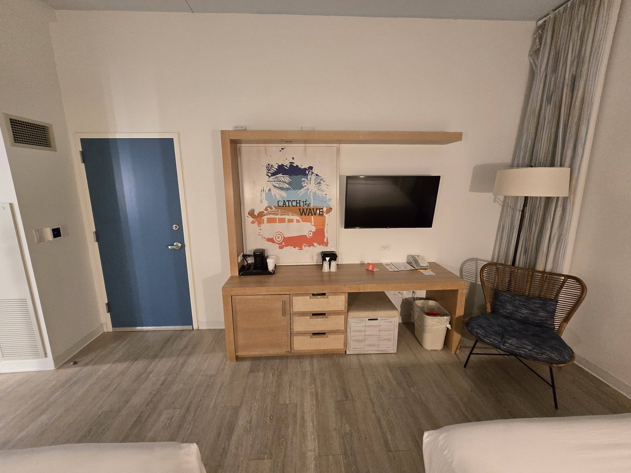 We got room 1186 which was on the main floor. For a newish hotel, the accessible room did not have an automatic button for the door. The room was very spacious even with 1 large Queen size bed and 1 double bed. There was a desk, chair, coffee maker, TV, mini fridge, and a safe.