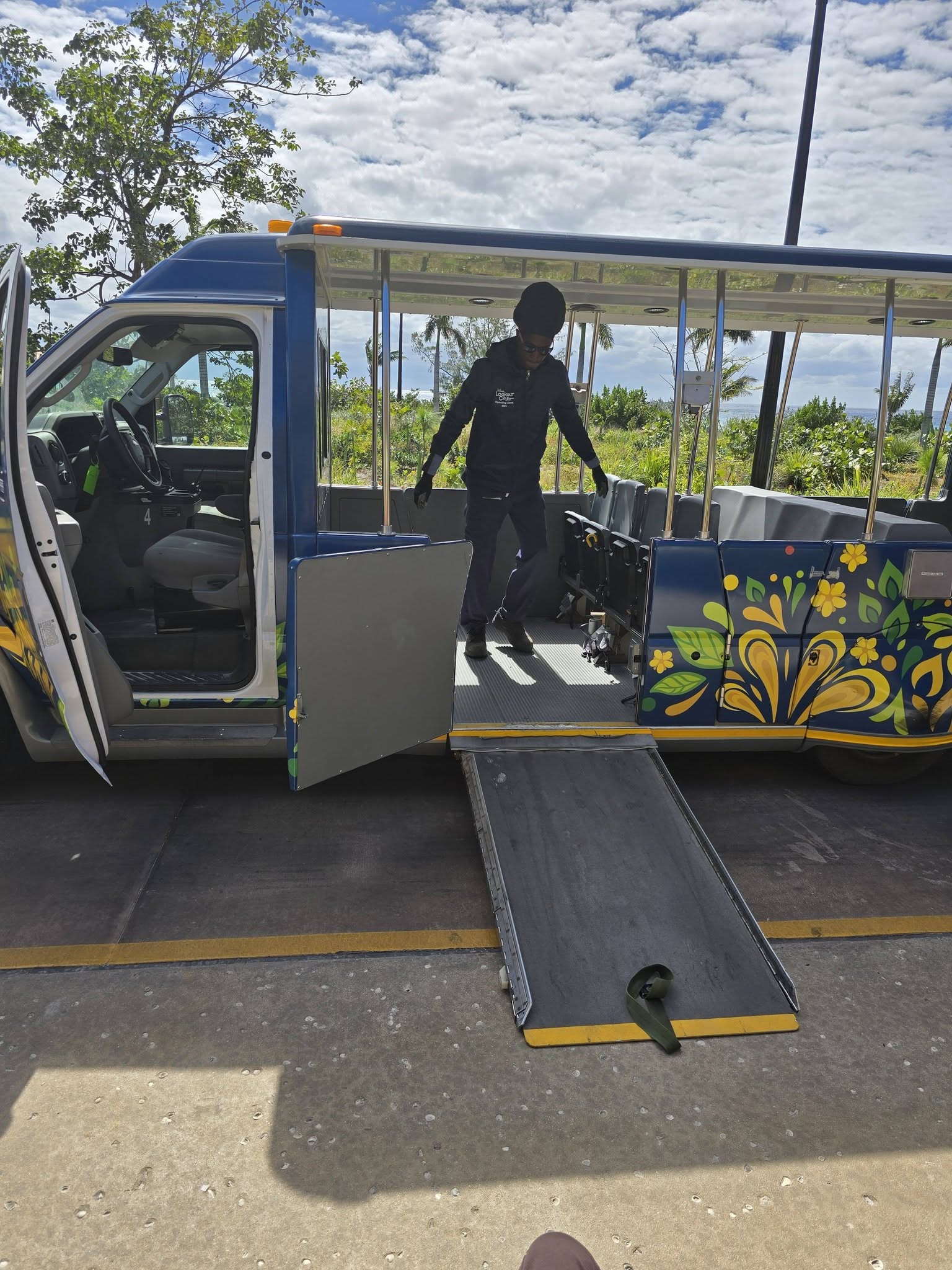 We waited to get on the wheelchair accessible golf cart to take us to Mabrika Cove which is the main transfer area.  This is only available for guests with mobility issues.  Once we are at Mabrika Cove, everyone is able to use the tram to get to the main area of Lookout Cay.  The trams all have a wheelchair spot right at the front.