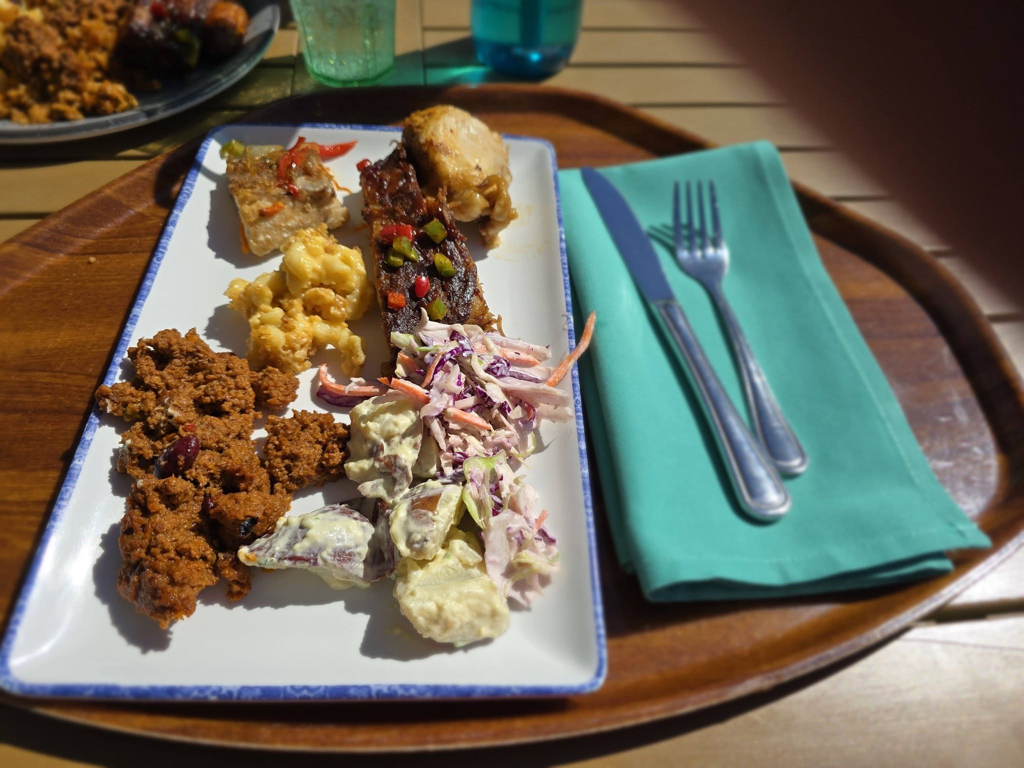 Since we never had breakfast or brunch yet, the first thing we did was head over to the adults only area to go to Serenity Bay BBQ.  I was just parked at a table while my friend got up to the food area to grab me a bunch of food.  There was rotisserie chicken, baked fish, ribs, potato salad, macaroni & cheese, taco meat and lots more.  The food was amazing, but we did have flies bothering us at times.
